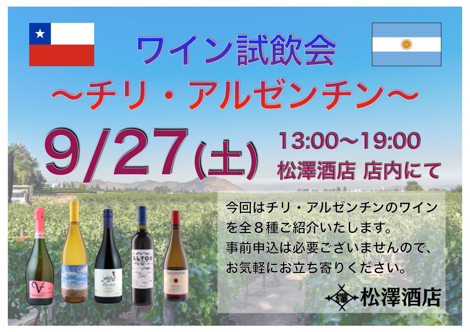 【9/27 チリ・アルゼンチンワイン 試飲会】 2025 9/25 インフォメーション 2025年9月20日2025年9月25日 ▶︎9月27日(土) ▶︎13:00〜19:00 ▶︎松澤酒店店内にて <事前申込不要> インフォメーション 【10/4 銘酒サミット2025】 【10/25 ハロウィンワイン 試飲会】