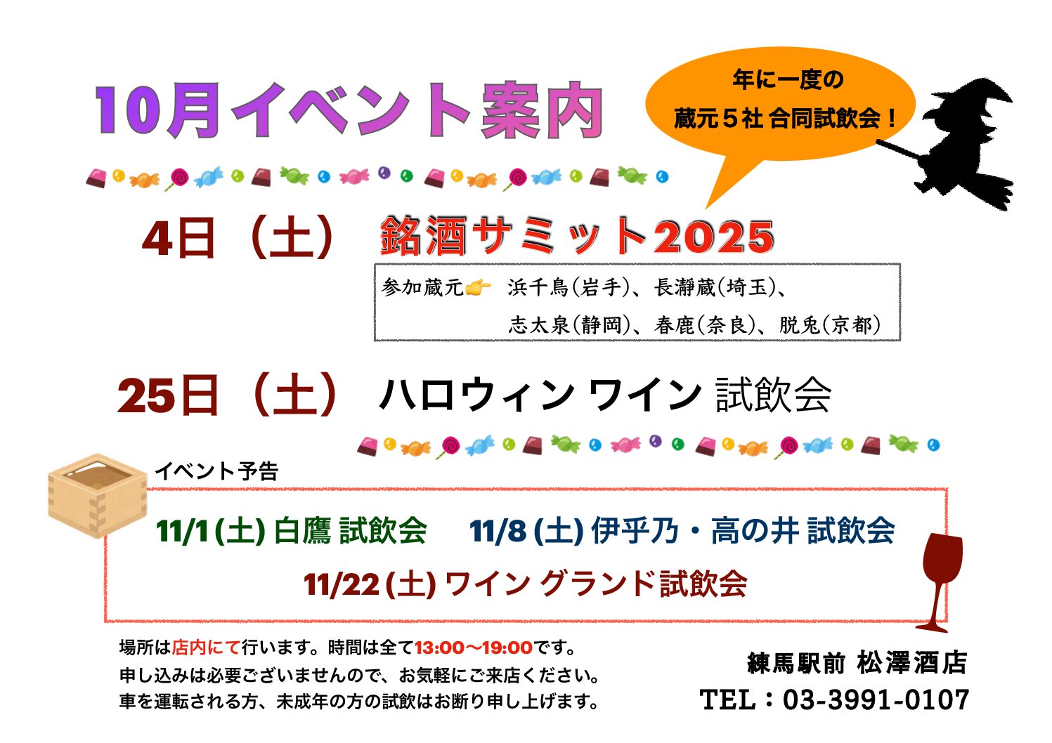 【10月イベント案内】 2025 9/25 インフォメーション 2025年9月15日2025年9月25日 10月4日(土) 銘酒サミット2025 10月25日(土) ハロウィンワイン 試飲会 時間は全て13:00〜19:00、店内にて行います。 皆様のご来店をお待ちしております。 インフォメーション 【9/20 〆張鶴 試飲即売会】 【10/4 銘酒サミット2025】