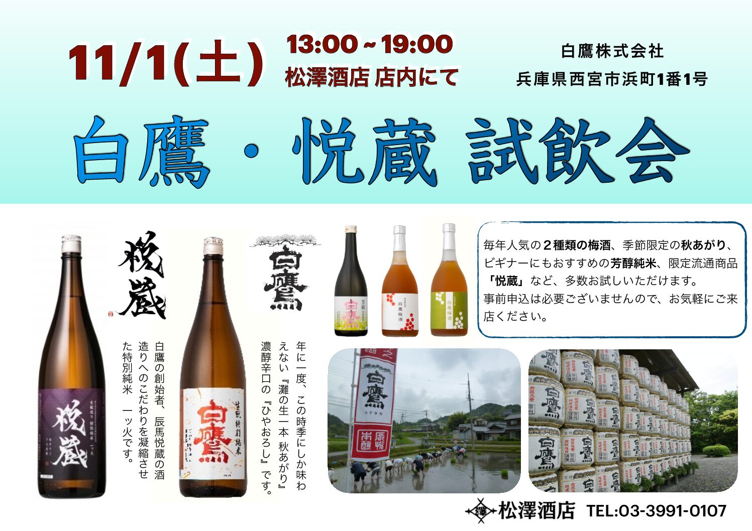 【11/1 白鷹・悦蔵 試飲会】 2025 10/27 インフォメーション 2025年10月25日2025年10月27日 ▶︎11/1 (土) ▶︎13:00〜19:00 ▶︎松澤酒店 店内にて 事前申込は必要ございませんので、お気軽にご来店ください。 インフォメーション 【ボジョレー・ヌーヴォーご予約開始のお知らせ】