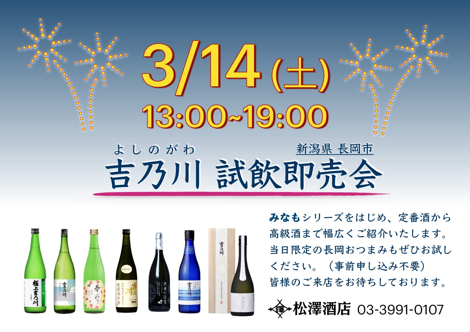 【3/14 吉乃川 試飲即売会】 2026 3/12 インフォメーション 2026年3月8日2026年3月12日 ▶︎3/14(土) ▶︎13:00〜19:00 ▶︎松澤酒店店内にて インフォメーション 【3/7 末廣 試飲即売会】