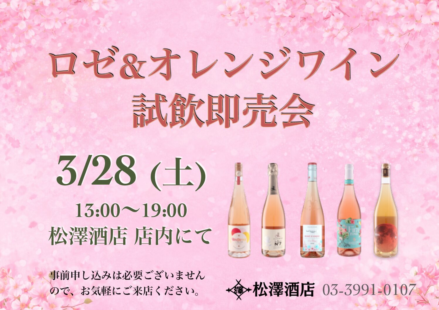 【4/4 ロゼ・オレンジワイン 試飲即売会】 2026 3/27 インフォメーション 2026年3月21日2026年3月27日 ▶︎4月4日(土) ▶︎13:00〜19:00 ▶︎松澤酒店 店内にて 事前申込は必要ございませんので、お気軽にご来店ください。 皆様のご来店をお待ちしております。 インフォメーション 【3/14 吉乃川 試飲即売会】 【4月イベント案内】