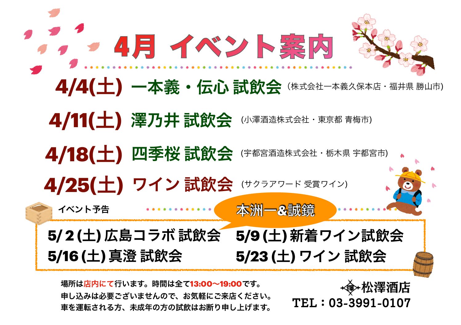 【4月イベント案内】 2026 3/27 インフォメーション 2026年3月27日 事前申込は必要ございませんので、お気軽にお立ち寄りください。 皆様のご来店を心よりお待ちしております。 インフォメーション 【4/4 ロゼ・オレンジワイン 試飲即売会】 【4/4 一本義・伝心 試飲即売会】